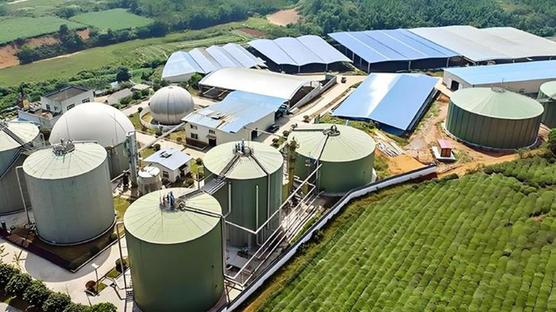 本工程为鸭粪发酵工程,采用“水解预处理 +CSTR 两级发酵 + 热电联产 + 高精度自动控制”的工艺路线,解决了鸭粪沼气工程中普遍遇到的进出料难及产气量低的问题,年处理自身及周边养殖场鸭粪污共约2.19×104t,发酵主体规模为8000m3,年生产沼气约2.34×106m3。